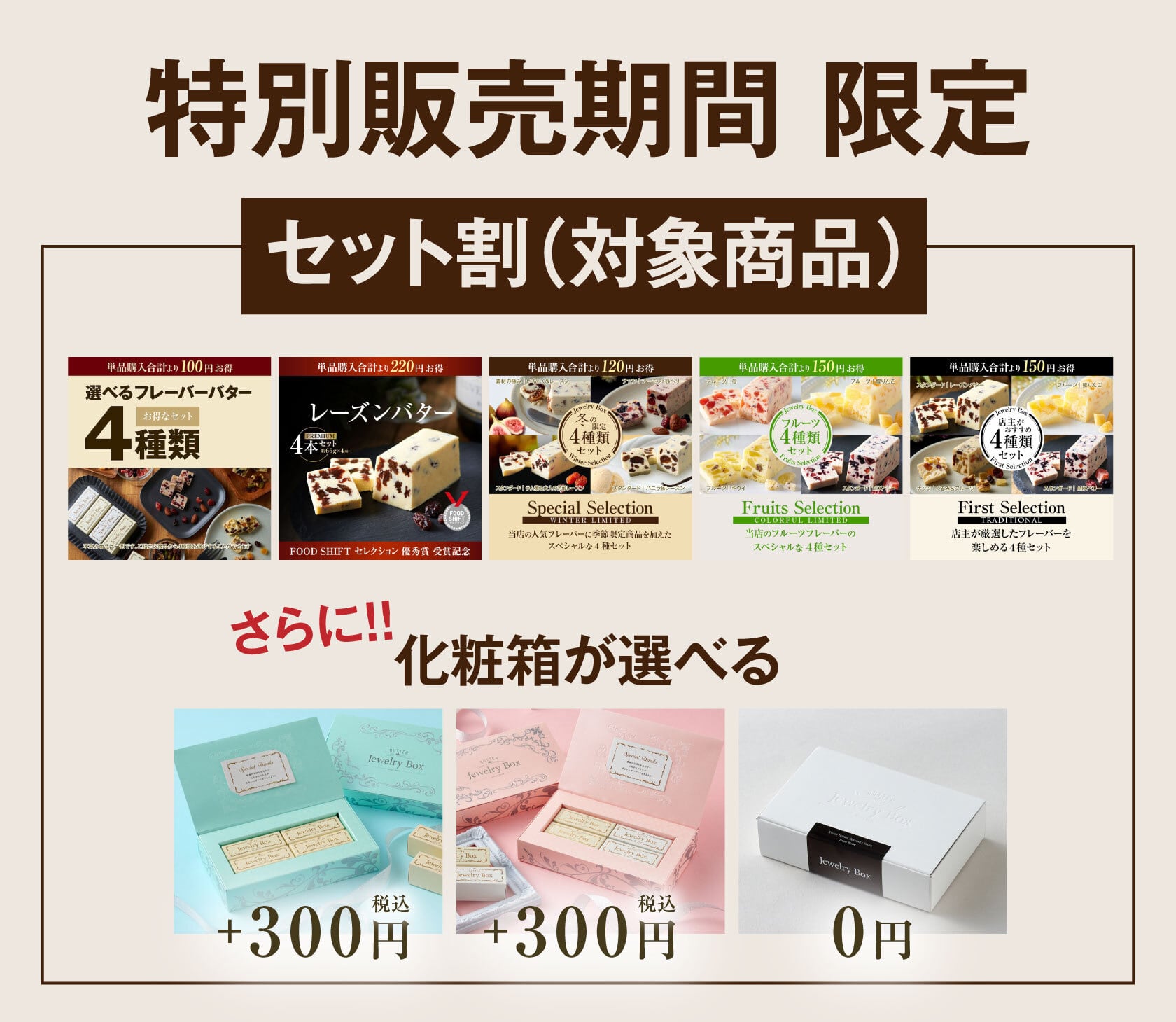 【配送・送料について】 ▲クール便にてお届けします。別途、下記の送料が必要です。 -------------■ 送料一覧 (税込)■-------------- 北海道:1,200円 沖縄県:1,700円 その他一律:1,000円 ----------------------------------------- ※配送業者(ヤマト運輸 または 佐川急便)は、当店にて決定いたします。お客様によるご指定はできかねますので、ご了承ください。 【お届け日の目安について】 ◼︎ 配送日をご指定の場合 ご注文日より5営業日(土・日・祝除く)以降の配送日を指定することができます。 ◼︎ 最短でのお届けをご希望の場合(お届け日指定なし/時間指定のみは可) お届け日の指定のないご注文については、発送準備が整い次第、最短で順次発送いたします。 (※配送日の目安は、ご注文日から3営業日(土・日・祝除く)前後になります。) ============================= First Selectionとは、どれを選べばいいかわからない!そんな方にJewelry Boxがお勧めする特定の4種類をピックアップしたフレーバーバターのセット商品です。 店主が初めてフレーバーバターを食べる方にお勧めする4品となります。 <内容> ・レーズン|プレミアムバター ・MIXベリー|プレミアムバター ・蜜りんご|リッチバターテイスト ・くるみ&フルーツ|リッチバターテイスト ============================= 【賞味期限】 発送より3ヶ月(未開封・冷凍保存) ※真空パック包装でお届けします。 【保存方法】 ・冷凍庫での保存をお勧めしています。(冷蔵庫での保存でも可) ・匂いうつりがしやすいので、匂いの強いものとは分けて保存してください。 ・開封後は賞味期限にかかわらず、お早めにお召し上がりください。 ----- 【お召し上がり方】 ◼︎そのままお召し上がりになる場合 冷凍のままでも美味しくお召し上がりいただけます。キンキンに冷えたバターはひと味違う美味しさですので是非お試しください。 ◼︎きれいにカットする場合 冷蔵庫で半日ほどかけて解凍後、包装しているアルミ紙ごと切ると綺麗に仕上がります。アルミ紙を剥がしてからお召し上がりください。 ----- 【おすすめの食べ方】 ・クラッカーやビスケットと一緒に ・バゲットと一緒に ----- 【内容量】 1本 約65g ×4 ※手作りの為、重さは多少前後いたします。 【箱サイズ】 高さ3.1cm × 幅3.2cm × 奥行8cm 【アレルゲン物質/全28品目中】 ・蜜りんご(乳・オレンジ・りんご) ・くるみ&フルーツ(乳・オレンジ・くるみ・キウイ) ・その他2種共通(乳・オレンジ) ※本製品の製造ラインでは、くるみ・アーモンド・キウイフルーツ・りんご・バナナを使用した製品も製造しています。 ==== レーズンバター|プレミアムバター ==== Jewelry Boxの原点である『レーズンバター』です。王道のレーズンバターを目指して、しっかりとしたレーズン感が楽しめつつ、レーズン嫌いの方でも食べられるマイルドな仕上がりになっています。レーズンバターファンには絶対1度は食べてみて欲しい!と自負できる仕上がりです。 【原材料】 バター(国内製造)(生乳・食塩)、レーズン、 ブランデー、オレンジ果汁、リキュール、レモン果汁 ※この商品は製造工程でブランデーおよびリキュールを使用しています。 ==== MIXベリー|プレミアムバター ==== ブルーベリー、クランベリー、ストロベリーのベリー系のみを使用しています。しっかりとしたベリー感が味わえます。 【原材料】 バター(国内製造)(生乳・食塩)、苺(砂糖)、クランベリー(砂糖・食物食用油脂)、ブルーベリー(砂糖)、ブランデー、リキュール、オレンジ果汁、レモン果汁/クエン酸、漂白剤(亜硫酸塩)、香料、着色料(赤40) ※この商品は製造工程でブランデーおよびリキュールを使用しています。 ==== 蜜りんご はちみつブレンド|リッチバターテイスト ==== たっぷりのりんごを使用し、りんごの酸味と甘みがしっかりと感じられます。はちみつ入りのバターベースでバランス良く仕上げました。 【原材料】 バター(国内製造)(生乳・食塩)、りんご(砂糖)、ナチュラルチーズ(生乳・食塩)、リキュール、はちみつ、オレンジ果汁、レモン果汁/安定剤(増粘多糖類)、クエン酸、酸化防止剤(亜硫酸塩)、香料 ※この商品ははちみつを使用しています。一歳未満の乳児には与えないでください。 ※この商品は製造工程でリキュールを使用しています。 ==== くるみ&フルーツ|リッチバターテイスト ==== レーズン.マンゴー.クランベリー.パイナップル.キウイの5種類のフルーツをブレンドしフルーツの豊かな味わいです。 バターベースにはザラメとくるみを混ぜ合わせ、くるみのカリッとした軽い食感とほんのりとした香ばしさや、ザラメのザクザク食感が楽しめる新食感フレーバーです。 【原材料】 バター(国内製造)(生乳・食塩)、ナチュラルチーズ(生乳・食塩)、ブランデー、くるみ、レーズン、クランベリー(砂糖・食物食用油脂)、マンゴー(砂糖)、 パイン(砂糖)、キウイ(砂糖)、砂糖、オレンジ果汁、リキュール、レモン果汁/安定剤(増粘多糖類)、クエン酸、酸化防止剤(亜硫酸塩)、カラメル色素 ※この商品は製