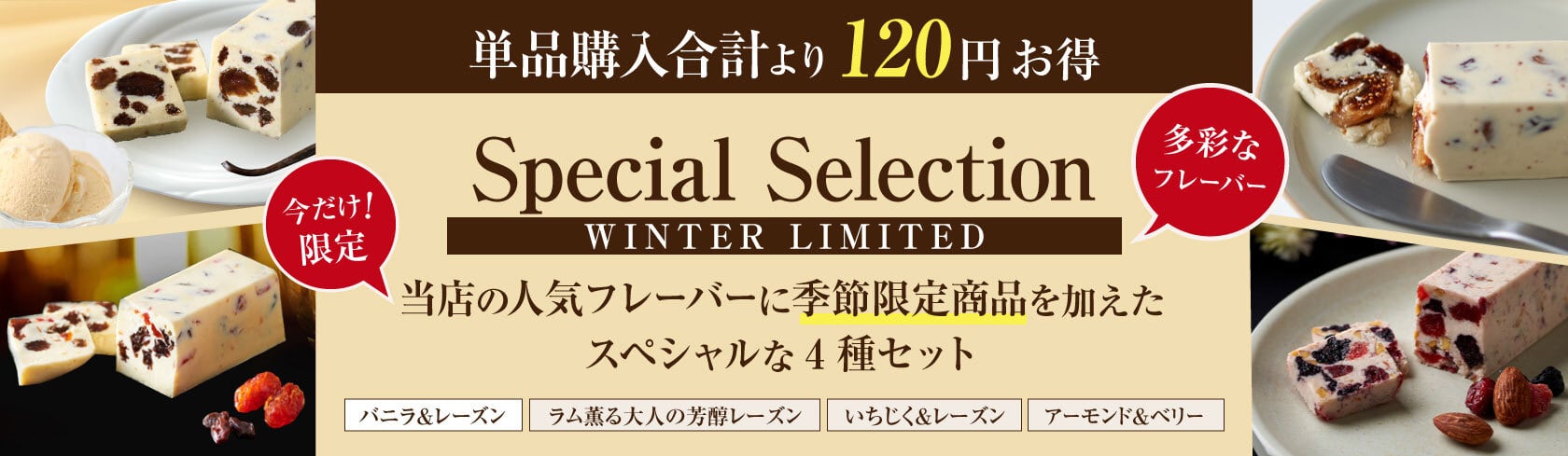 【配送・送料について】 ▲クール便にてお届けします。別途、下記の送料が必要です。 -------------■ 送料一覧 (税込)■-------------- 北海道:1,200円 沖縄県:1,700円 その他一律:1,000円 ----------------------------------------- ※配送業者(ヤマト運輸 または 佐川急便)は、当店にて決定いたします。お客様によるご指定はできかねますので、ご了承ください。 【お届け日の目安について】 ◼︎ 配送日をご指定の場合 ご注文日より5営業日(土・日・祝除く)以降の配送日を指定することができます。 ◼︎ 最短でのお届けをご希望の場合(お届け日指定なし/時間指定のみは可) お届け日の指定のないご注文については、発送準備が整い次第、最短で順次発送いたします。 (※配送日の目安は、ご注文日から3営業日(土・日・祝除く)前後になります。) ============================= 『春の限定4種類セット』は、当店の人気フレーバーに季節限定商品を加えた、特別な組み合わせです。 今季は、季節限定『柑橘&レーズン』が仲間入り。 当店一番人気の『いちじく&レーズン』、ベリーの贅沢な風味にアーモンドの食感が楽しい『アーモンド&ベリー』、そしてラムが芳醇に香る大人の味わい『ラム薫る大人の芳醇レーズン』。 春だけの限定フレーバーを含む、4種類をセレクトしました。 期間限定で、特別価格にてご用意しております。 <内容> ・[季節限定]柑橘&レーズン|プレミアムバター ・ラム薫る大人の芳醇レーズン|プレミアムバター ・いちじく&レーズン|素材の極みバター ・アーモンド&ベリー|リッチバターテイスト ============================= 【持ち運び用 保冷袋セット】 持ち運びにとても便利な保冷袋と保冷剤のセットです。 価格:150円 ※ご利用の場合は、商品ページの購入時のオプションで選択してください。 ----- 【賞味期限】 発送より3ヶ月(未開封・冷凍保存) ※真空パック包装でお届けします。 【保存方法】 ・冷凍庫での保存をお勧めしています。(冷蔵庫での保存でも可) ・匂いうつりがしやすいので、匂いの強いものとは分けて保存してください。 ・開封後は賞味期限にかかわらず、お早めにお召し上がりください。 ----- 【お召し上がり方】 ◼︎そのままお召し上がりになる場合 冷凍のままでも美味しくお召し上がりいただけます。キンキンに冷えたバターはひと味違う美味しさですので是非お試しください。 ◼︎きれいにカットする場合 冷蔵庫で半日ほどかけて解凍後、包装しているアルミ紙ごと切ると綺麗に仕上がります。アルミ紙を剥がしてからお召し上がりください。 ----- 【おすすめの食べ方】 ・クラッカーやビスケットと一緒に ・バゲットと一緒に ----- 【内容量】 1本 約65g ×4 ※手作りの為、重さは多少前後いたします。 【箱サイズ】 高さ3.1cm × 幅3.2cm × 奥行8cm 【アレルゲン物質/全28品目中】 ・アーモンド&ベリー(乳・オレンジ・アーモンド) ・その他3種共通(乳・オレンジ) ※本製品の製造ラインでは、くるみ・アーモンド・キウイフルーツ・りんご・バナナを使用した製品も製造しています。 ==【柑橘&レーズン ‐ほろ苦仕立て‐|プレミアムバター】== 少しだけ甘さを控えめにした、ほろ苦いレーズンです。 今回ははっさくを使い、糖漬けピールを果汁にくぐらせて3種のレーズンと合わせました。 やさしい甘みのあとに、はっさくのほろ苦さが静かに残ります。 【原材料】 バター(国内製造)(生乳・食塩)、レーズン、八朔果皮(八朔・砂糖)、 ブランデー、オレンジ果汁、リキュール、レモン果汁、八朔果汁 ※この商品は製造工程でブランデーおよびリキュールを使用しています。 ==『素材の極み』【いちじく&レーズン】== なめらかなバターの中で、いちじくのプチプチとした食感と、ふっくらと柔らかなレーズンの食感が絶妙なハーモニーを奏でます。バターの濃厚な風味に、いちじくの奥深い甘さとレーズンの優しい甘みが溶け合い、一口ごとに異なる味わいの変化をお楽しみいただけます。シンプルな素材だからこそ際立つ、それぞれの美味しさを存分にご堪能ください。 【原材料】 バター(国内製造)(生乳・食塩)、ドライいちじく、レーズン、ラム酒、 ブランデー、オレンジ果汁、リキュール、レモン果汁、食塩 ※この商品は製造工程でブランデー・ラム酒、およびリキュールを使用しています。 ====アーモンド&ベリー|リッチバターテイスト==== リームチーズを練り込むことで、まろやかなバター感となめらかな口どけを実現した特製バターベース。リキュールに漬け込んだ3種類のベリー(苺、クランベリー、ブルーベリー)は甘酸っぱく芳醇な香りを放ち、アーモンドの香ばしい風味とカリッとした食感が加わることで、新たなハーモニーを奏でます。この豊かな風味と食感のコントラストは、まさに心ときめく特別な味わいです。 【原材料】 バター(国内製造)(生乳・食塩)、ナチュラルチーズ(生乳・食塩)、アーモンド、苺(砂糖)、クランベリー(砂糖・植物油)、ブルーベリー(砂糖)、リキュール、練乳(生乳・しょ糖)、オレンジ