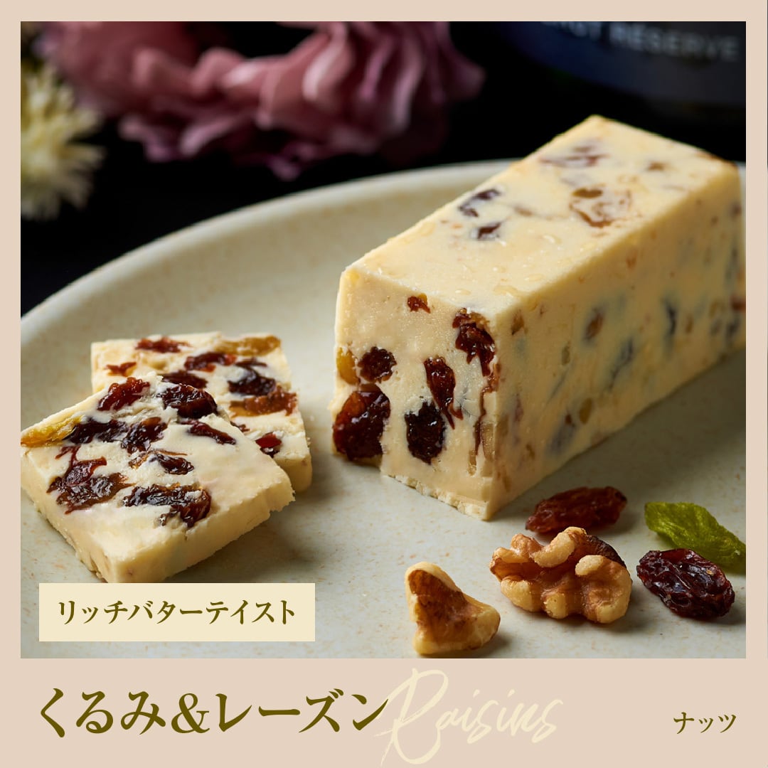 バター(国内製造)(生乳・食塩)、ナチュラルチーズ(生乳・食塩)、レーズン、ブランデー、くるみ、砂糖、オレンジ果汁、リキュール、レモン果汁/安定剤(増粘多糖類)、カラメル色素